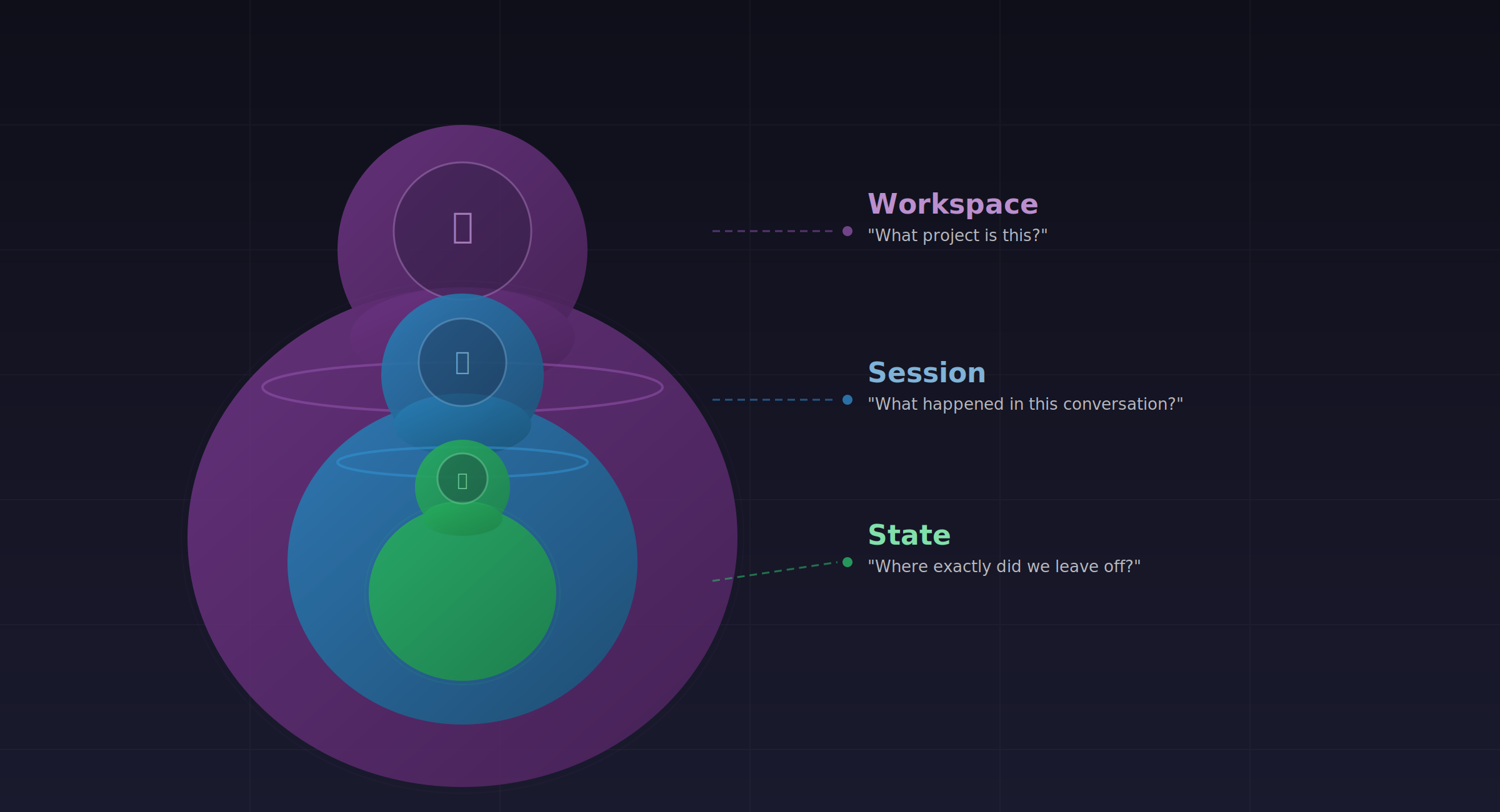 The insight: memory isn't one thing. It's three nested containers. Workspace scopes the project. Session tracks the conversation. State preserves the moment.